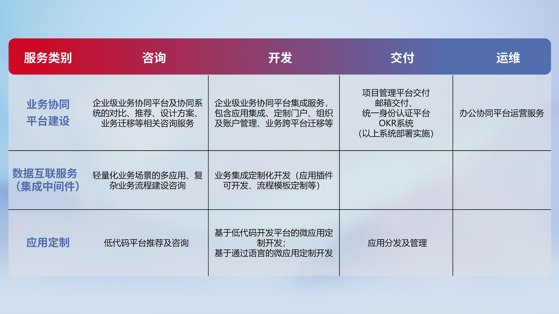 针对钉钉、、、企微、、、IDaas等平台级产品提供产品的规划、、方案、、、、交付、、、定制化开发等服务,,,,实现如统一协同办公、、、智能客户服务、、、、混合会议管理、、智能数据查询、、等业务场景,,,,实现数字化转型。。。。